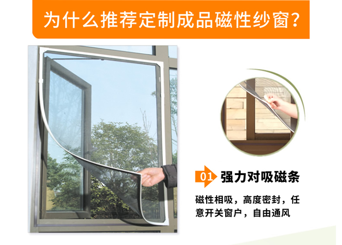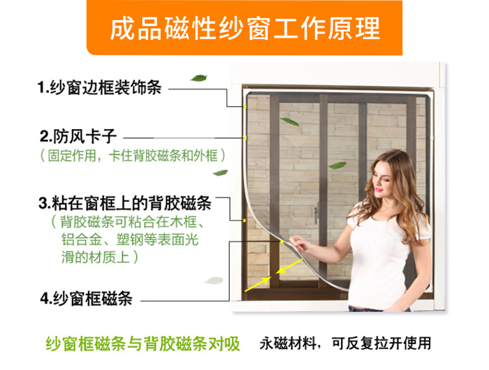 防霧霾紗窗磁性防霧霾紗窗不破壞窗框,直接粘貼到窗框上磁性防霧霾紗窗不破壞窗框,直接將窗紗粘貼到窗框上磁性防霧霾紗窗是單面背膠磁條與紗窗磁條對(duì)吸磁性防霧霾紗窗是單面背膠磁條與紗窗磁條對(duì)吸,可以反復(fù)拉開和吸附。磁性防霧霾紗窗框顏色有四種可選磁性防霧霾紗窗框顏色有四種可選,白色、灰色、綠色、咖啡色。