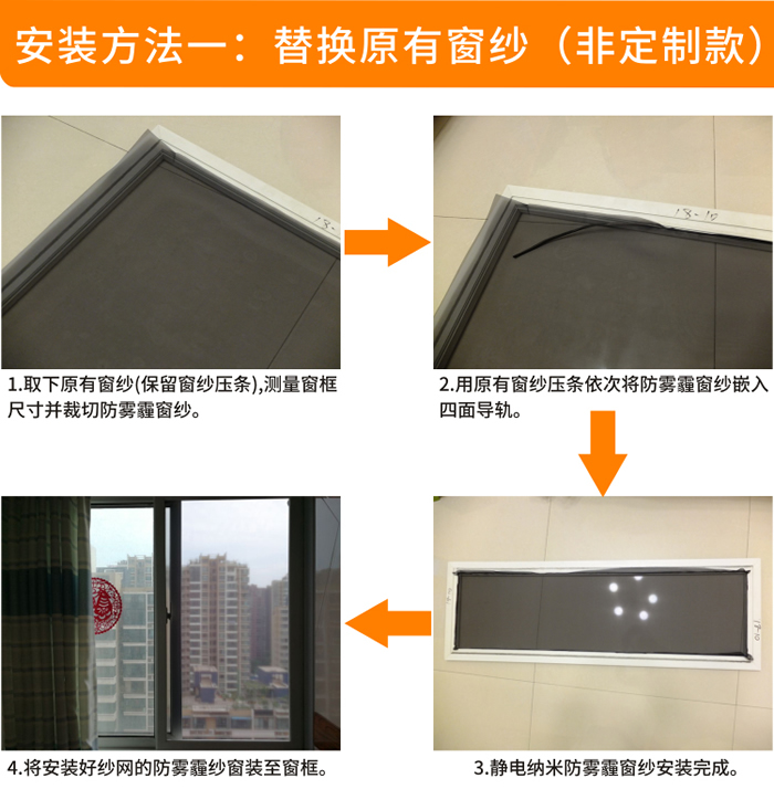 普通紗窗與防霧霾紗窗效果的對(duì)比普通紗窗與防霧霾紗窗效果的對(duì)比防霧霾紗窗透風(fēng)效果展示防霧霾紗窗透風(fēng)效果展示強(qiáng)光透過防霧霾紗窗時(shí),光線變得柔和不刺眼強(qiáng)光透過防霧霾紗窗時(shí),光線變得柔和不刺眼防霧霾紗窗不擔(dān)心雨天忘記關(guān)窗戶防霧霾紗窗不擔(dān)心雨天忘記關(guān)窗戶防霧霾紗窗就是再小的蚊蟲也不能進(jìn)入防霧霾紗窗就是再小的蚊蟲也不能進(jìn)入防霧霾紗窗的安裝方式有三種防霧霾紗窗的安裝方式有三種:第一種是將普通紗窗網(wǎng)直接更換成防霧霾紗窗網(wǎng),依舊裝載原來的紗窗框上即可。